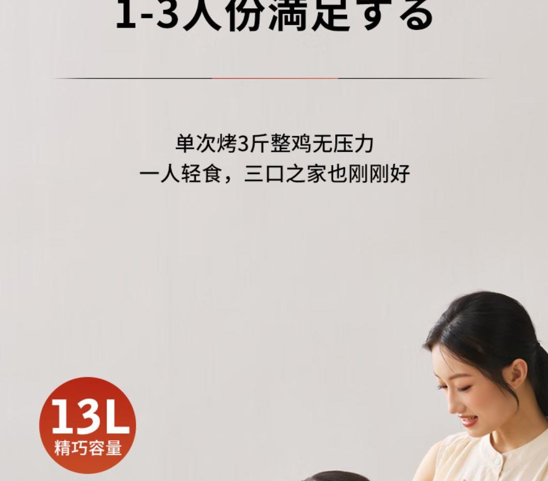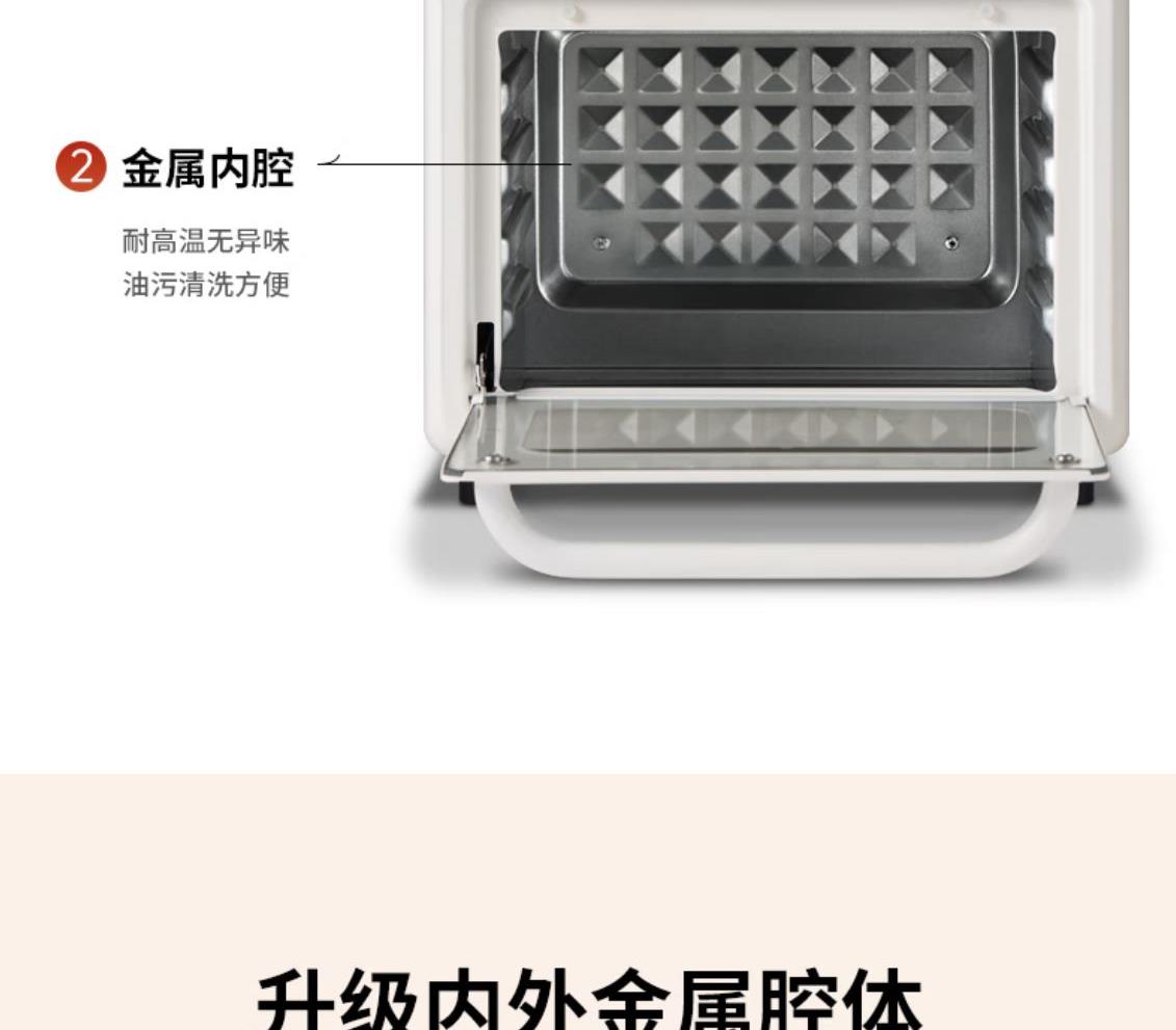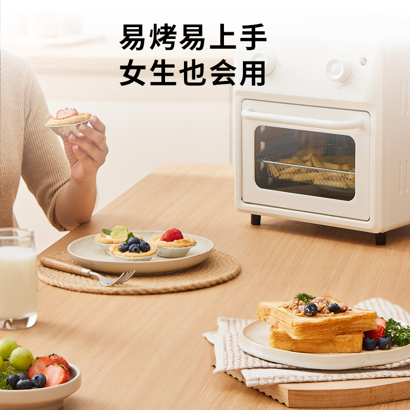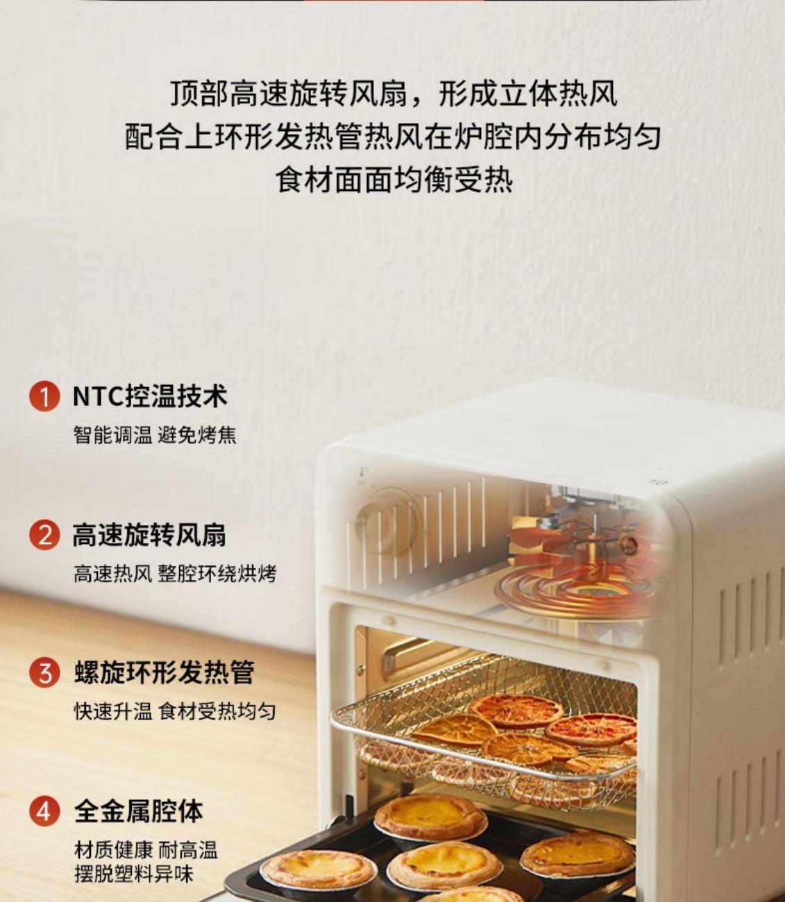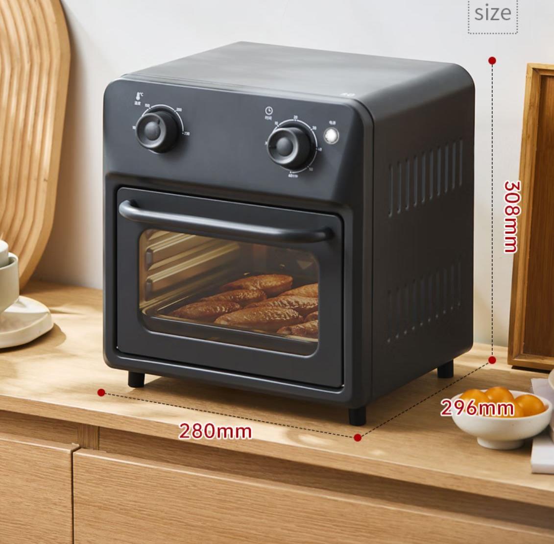 溫度調(diào)節(jié):100℃-230℃ 發(fā)熱方式:蚊香型發(fā)熱管 操作界面:機械式 容量:13L 額定電壓:220V 額定功率:1360W 產(chǎn)品尺寸:長280mm 寬296mm 高308mm 產(chǎn)品凈重:2kg 加熱方式:熱風(fēng) 內(nèi)膽材質(zhì):鍍鋅 可視玻璃門 空氣炸烤箱,功能更豐富炸、烤、烘焙樣樣行 金屬內(nèi)膽更安全 雙旋鈕設(shè)計操作簡單秒上手