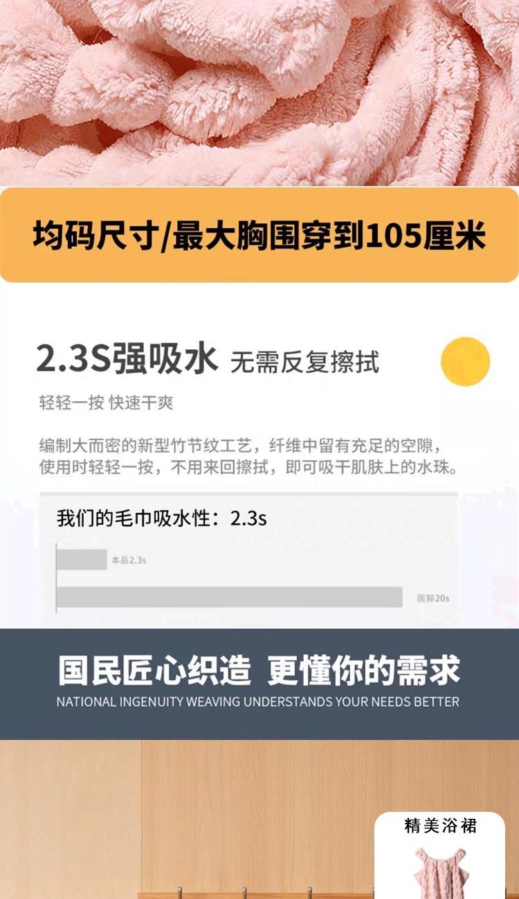 貨號:ZMN-MJ023 規(guī)格:干發(fā)帽:25*65cm*1 浴裙:100*140cm*1、毛巾:35*75cm *1 面料:珊瑚絨(滌綸+錦綸) 賣的: 1、人性化設計,美觀,舒適的基礎上,也保存了功能性。 2、甄選原料,遠離掉毛煩惱,高吸水性 3、撞色包邊,時尚設計,不起毛邊