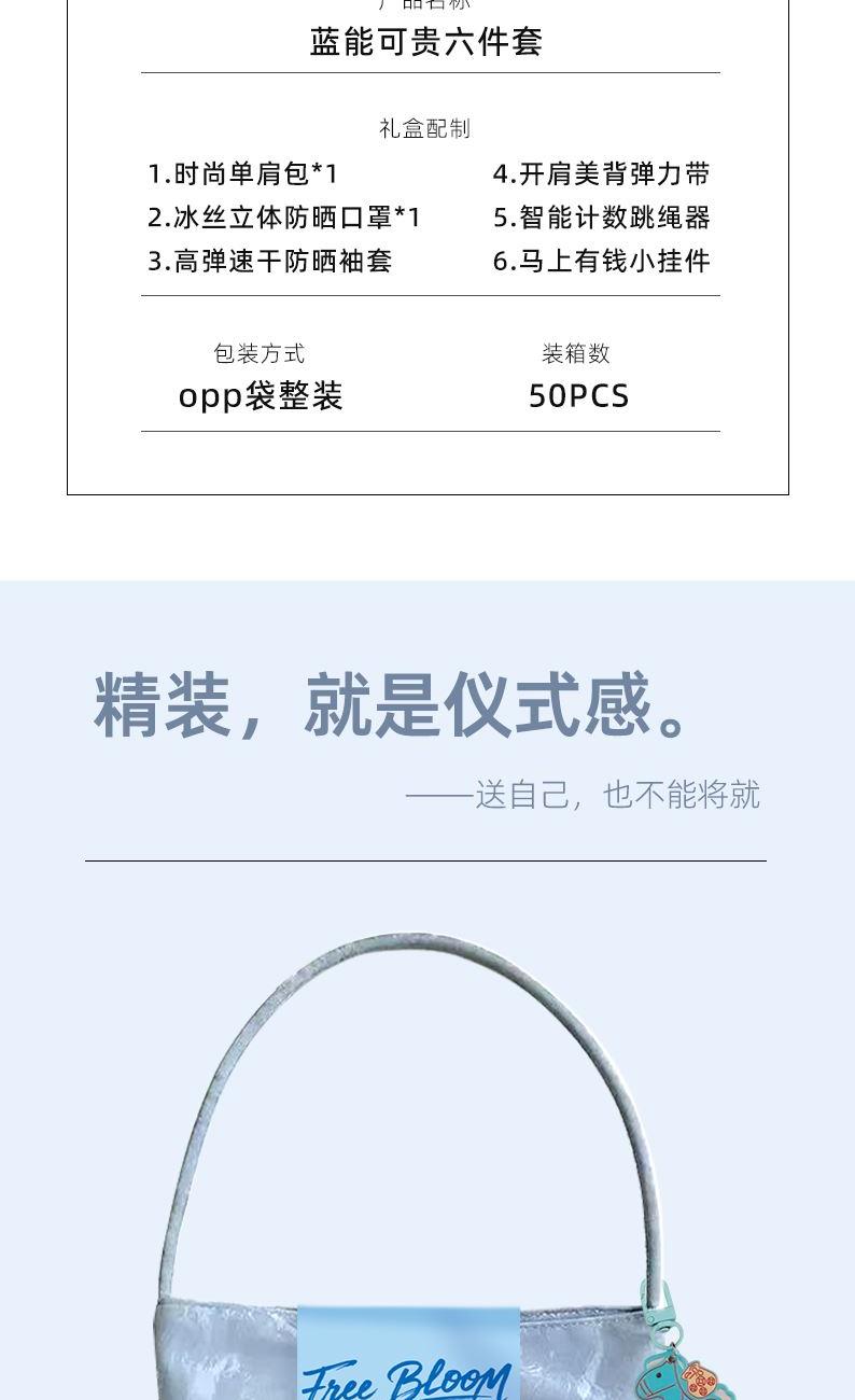 禮盒配制:1.時尚單肩包*1 2.冰絲立體防曬口罩*1 3.高彈速干防曬袖套 4.開肩美背彈力帶 5.智能計數(shù)跳繩器 6.馬上有錢小掛件 包裝方式:opp袋整裝