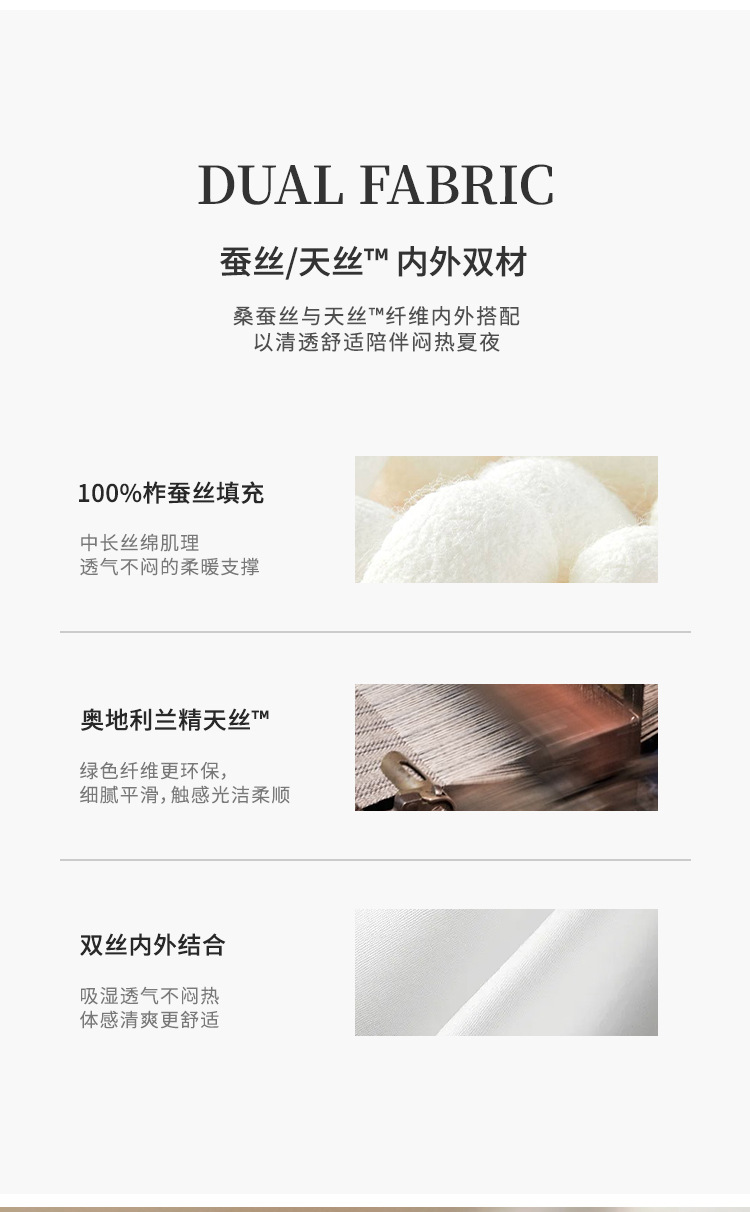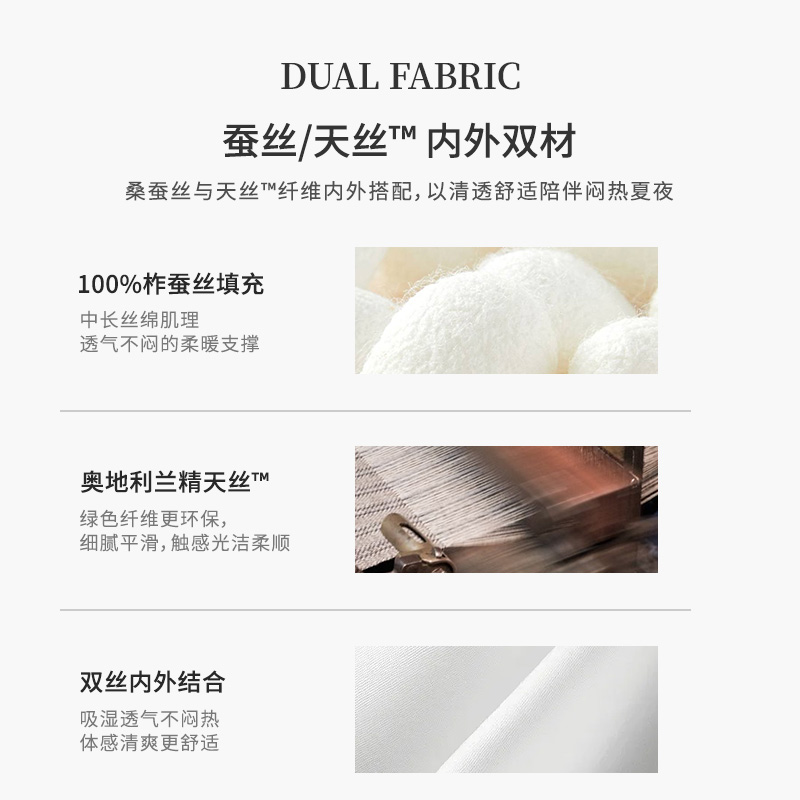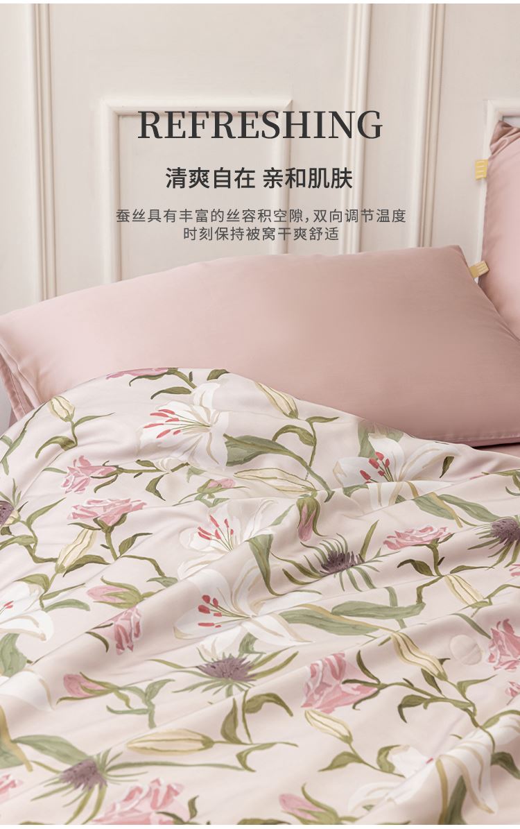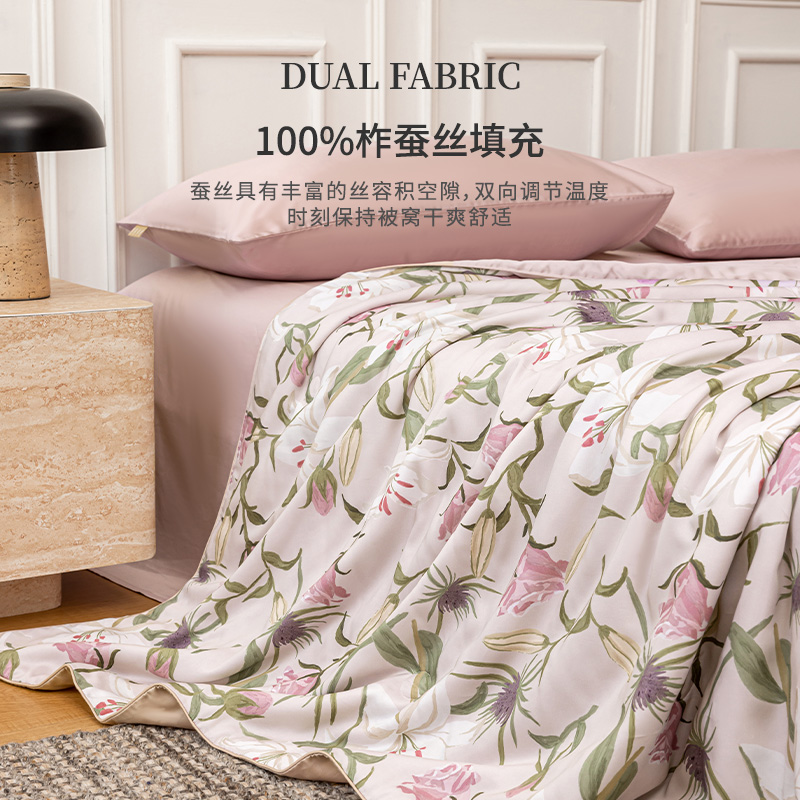 商品參數(shù): 面料:100萊賽爾纖維 內(nèi)襯:100聚酯纖維 填充:100柞蠶絲(中長絲綿) 填充克重:200g 規(guī)格:150*200cm(200*230可訂制)