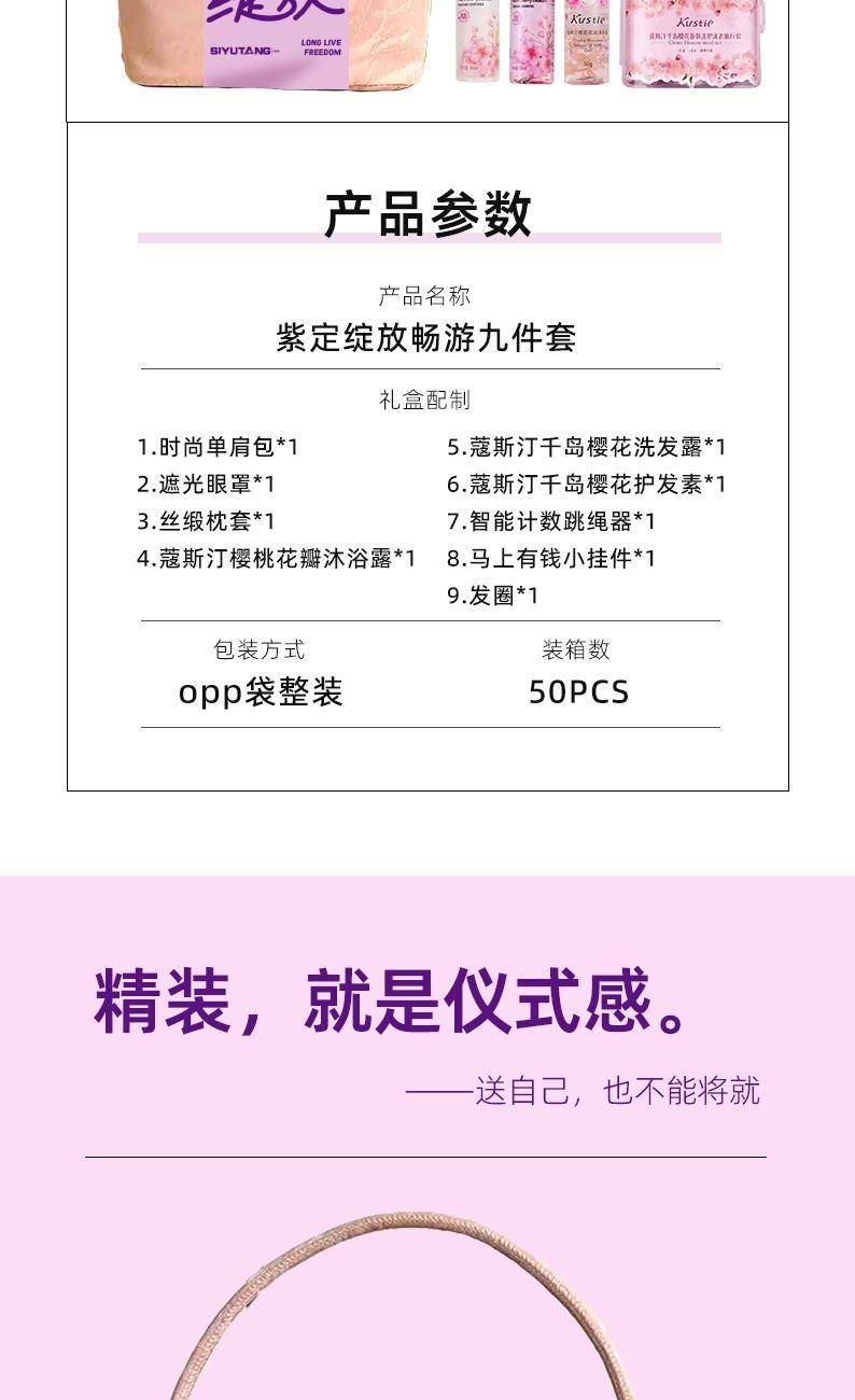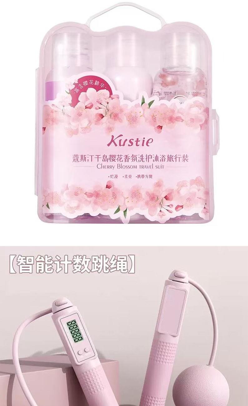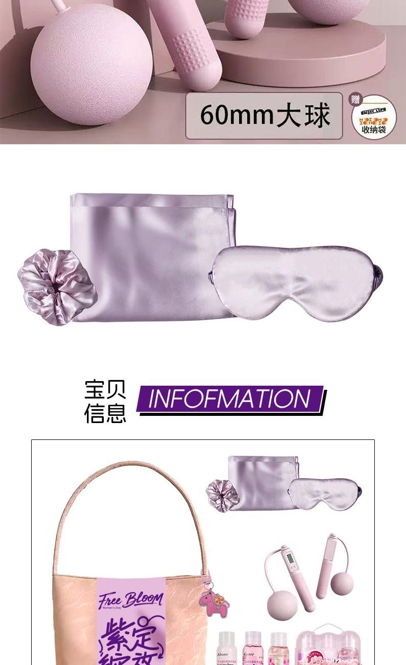禮盒配制:1.時(shí)尚單肩包*1 2.遮光眼罩*1 3.絲緞?wù)硖?1 4.蔻斯汀櫻桃花瓣沐浴露*1 5.蔻斯汀千島櫻花洗發(fā)露*1 6.蔻斯汀千島櫻花護(hù)發(fā)素*1 7.智能計(jì)數(shù)跳繩器*1 8.馬上有錢(qián)小掛件*1 9.發(fā)圈*1 包裝方式:opp袋整